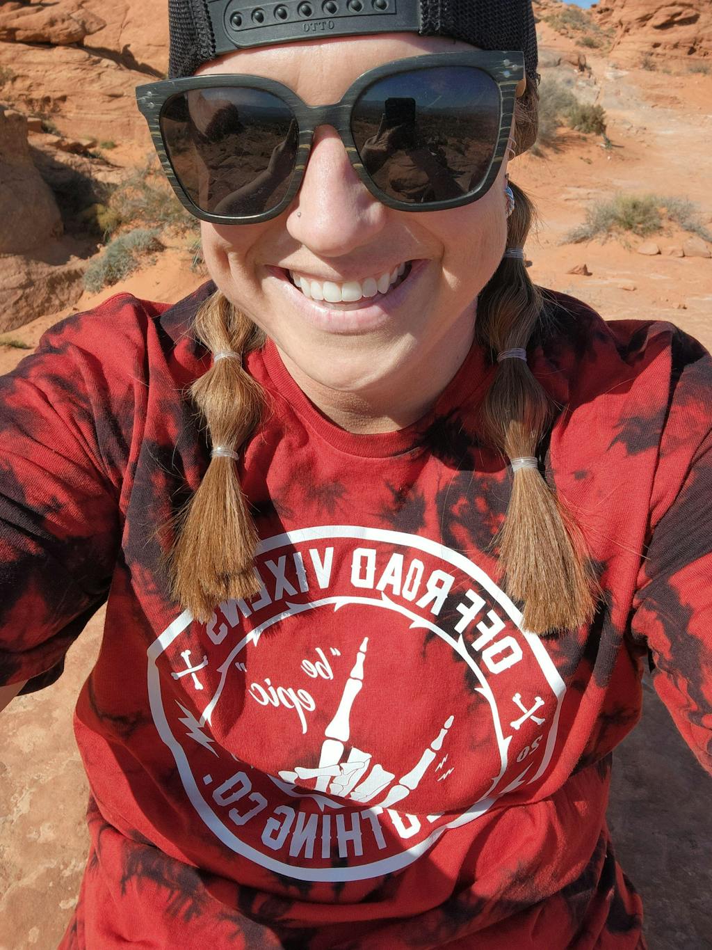 Channel hardcore dirt and throttle energy in the Be Epic Crystal Dyed Tee—a fierce combo of grunge style and off-road edge. With a one-of-a-kind red and black crystal-dyed finish, this tee is a statement piece even before you turn around. The back graphic features the iconic skeleton hand throwing the rock sign with the words "be epic", all wrapped in the Off-Road Vixens Clothing Co. seal.