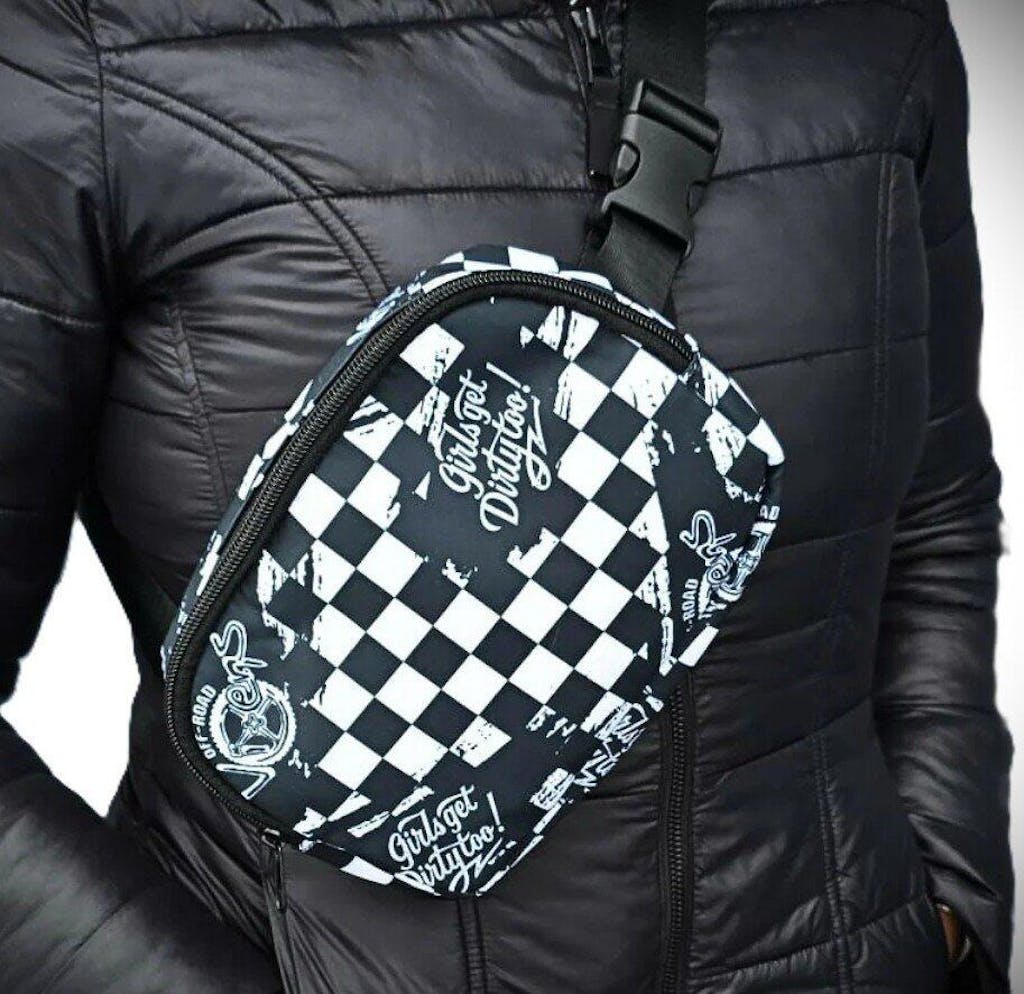 Small bag, big personality. The Checkered Crossbody Bag packs Off-Road Vixens swagger into a compact silhouette that’s perfect for everyday carry. Covered in a black-and-white distressed checkered print with “Girls Get Dirty Too!” and Off-Road Vixens graphics throughout, this bag brings an edgy, moto-inspired vibe to any outfit. The adjustable strap lets you wear it across your body or over your shoulder. Ideal for travel, events, trail days, or quick errands—this bag is all function with a healthy dose of attitude.